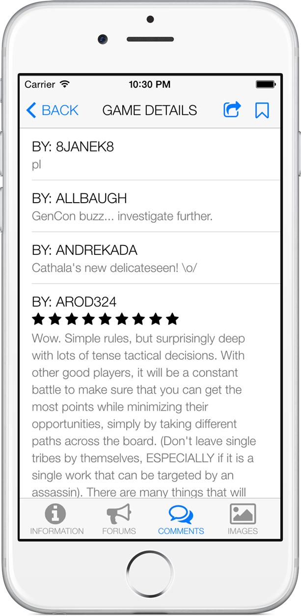 iBGG is an unofficial BGG reference app. It was designed to be used as a quick and easy reference for anyone to find information about their favorite board games. With the ability to bookmark games, you always have your favorite games at your fingertips.